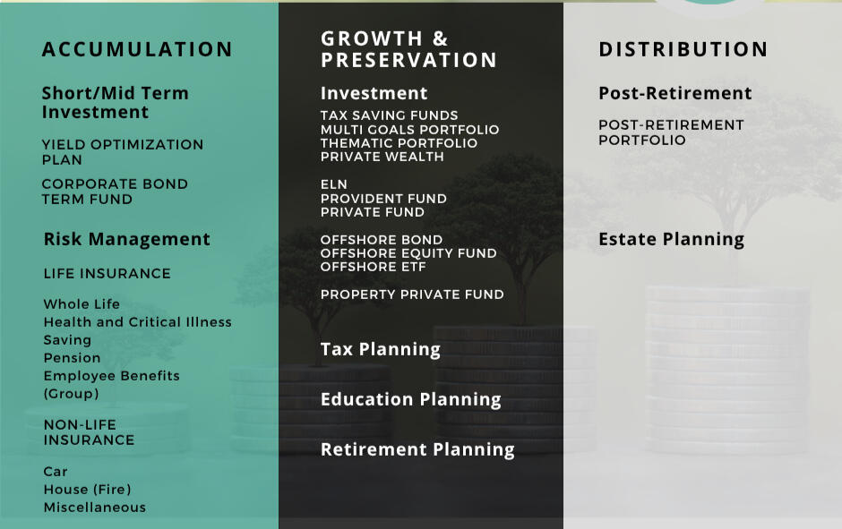 บริการของเราครอบคลุมการวางแผนการเงินในทุกช่วงชีวิตของคุณ ตั้งแต่การบริหารความเสี่ยงและเริ่มสร้างความมั่งคั่ง ต่อยอดและรักษาความมั่งคั่ง ตลอดจนการส่งต่อความมั่งคั่ง เราจะเป็นผู้ช่วยที่เดินไปกับคุณได้ตลอดทาง